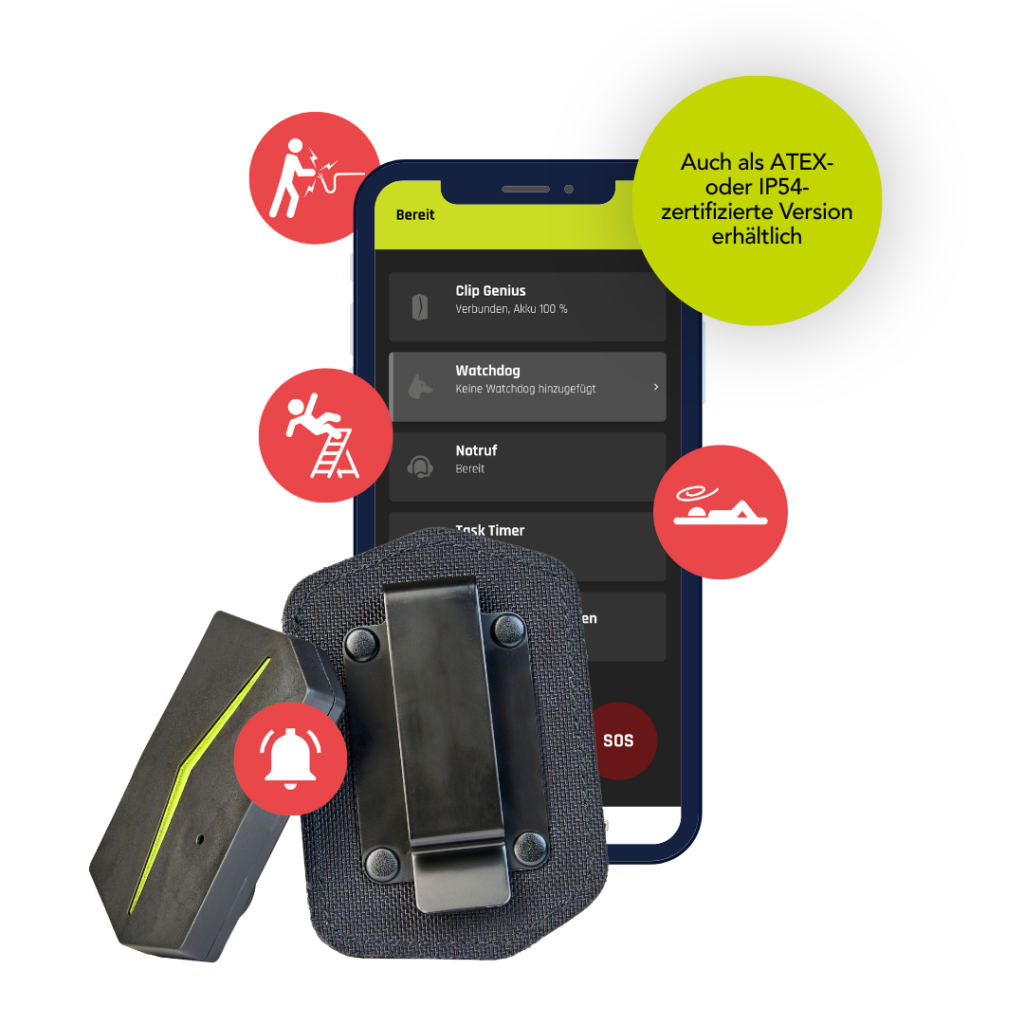 Das ANGEL React Clip System kombiniert einfache Anwendungen mit einem hohen Maß an Arbeitssicherheit. Der Clip Genius als das zentrale Element des Systems erkennt Notfälle und setzt bei Bedarf blitzschnell die Notrufkette in Gang.