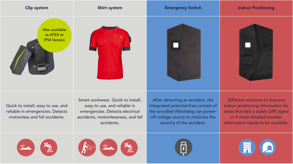 Our basic products adapt flexibly to your everyday work. The Clip system detects motionlessness and fall accidents, and is therefore our highlight when it comes to lone working. The Shirt system also detects electrical accidents and is suitable for lone working as well. Our intelligent shirts are available in different versions. The Location Beacon provides precise location information in large areas and also covers areas without a GPS signal (e.g. basements, tunnels, buildings). The Watchdog can trigger an emergency-off.